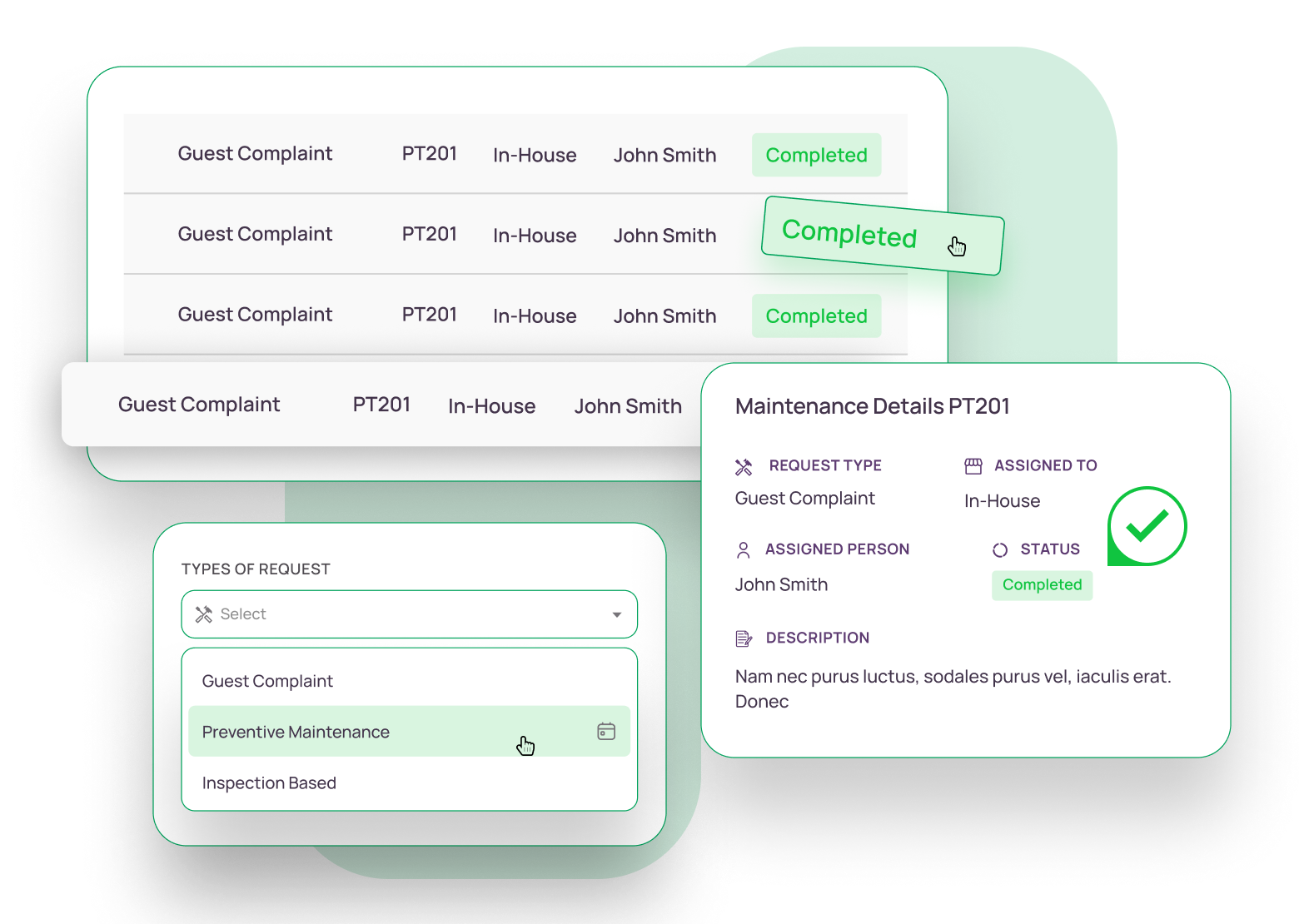 Easily store logs and track maintenance record identified by housekeeping for a quick solution and prioritizing guest comfort